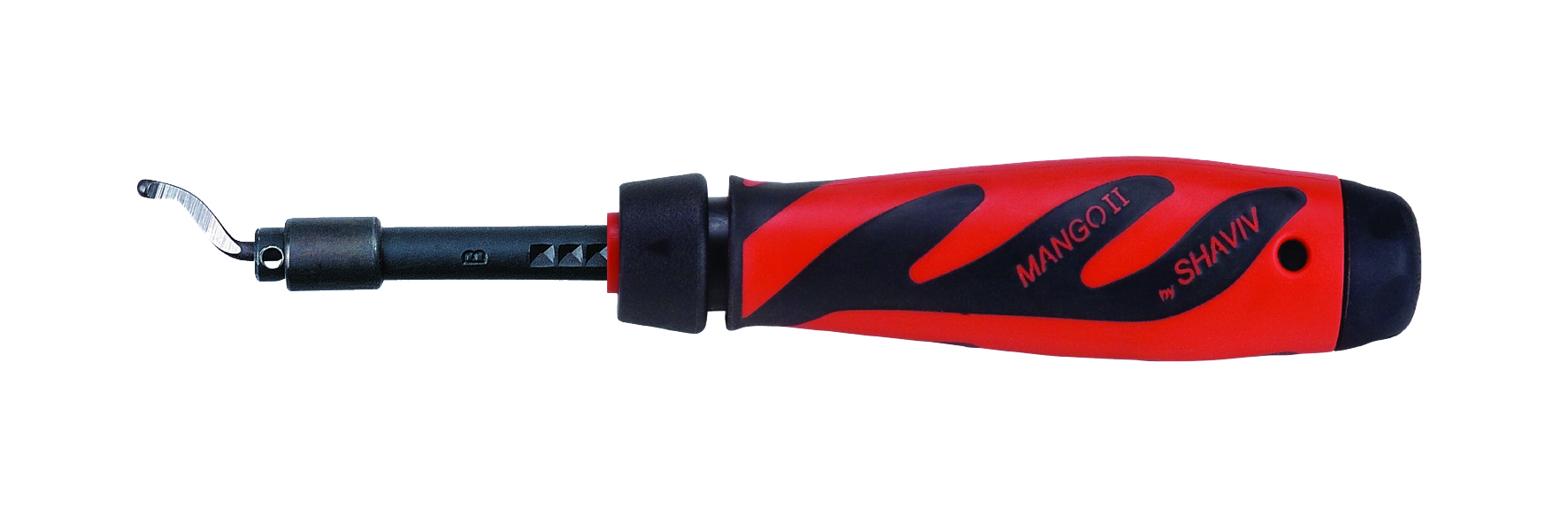 Original Shaviv Handentgrater Typ B mit Handgriff Mango, Stahlhalter und je einer Klinge B10 und B20. Klingen (2,8 mm) können radial und axial eingesetzt werden. Für ziemlich alle Metalle und Kunststoffe geeignet.